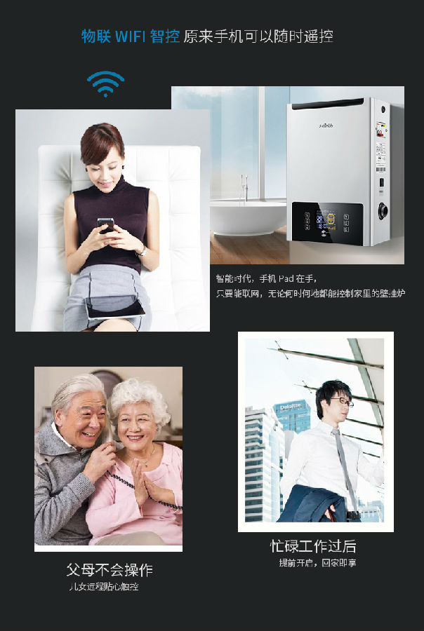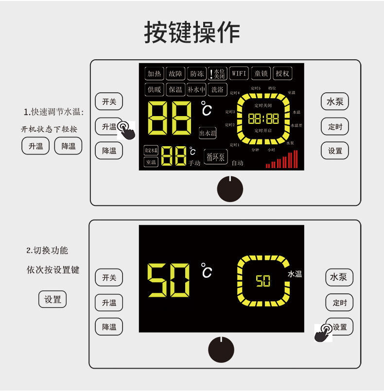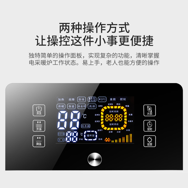 動態(tài)彩屏顯示:實(shí)時顯示采暖系統(tǒng)溫度,及工作狀態(tài)。