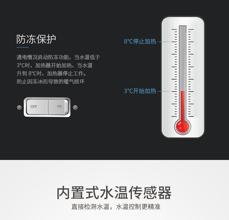 2. 多重防漏電保護(hù)功能,防缺水、防漏電、防凍、防超溫、防干燒、防潮抗干擾功能、全方位故障檢測,安全可靠。