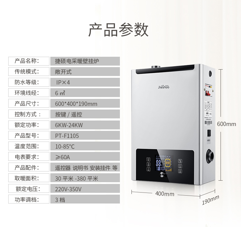 產(chǎn)品簡介: 捷碩壁掛式 電鍋爐 ,采用雙進(jìn)水,單出水設(shè)計(jì),外置水泵,外置補(bǔ)水箱,外置排氣閥。優(yōu)雅外觀,性價比高,有多個版本可選擇。 型號: PT-F1105 功率:2-3-4-5-6-8-10-12KW 220V 功率:6-8-10-12-14-16-20-2......